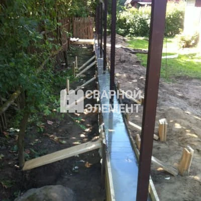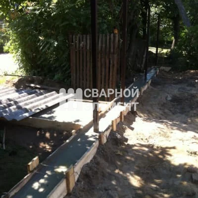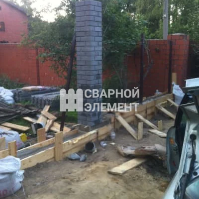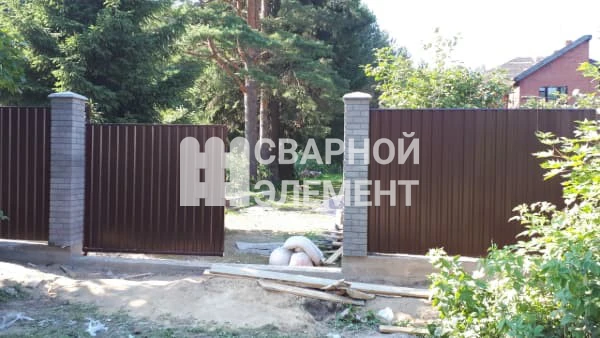 • Забор из профлиста высота 2 метра, бетонно-монолитная лента высота ленты 600 мм. Столбы из декоративных кирпичных блоков.